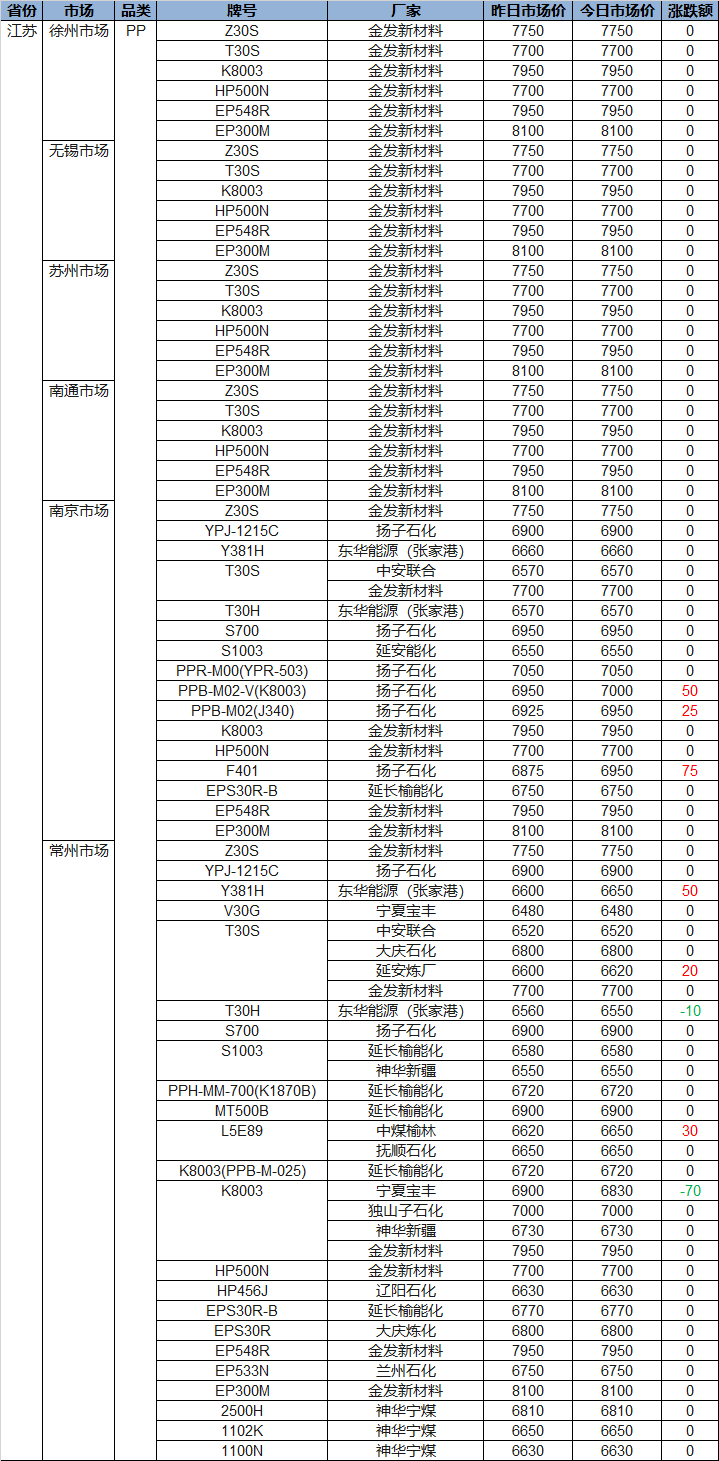 [Today's PP, PE Jiangsu Plastic Prices] PE Drops by Up to 500; PP Mostly Stable with Minor Fluctuations, Local Increases/Decreases of 10-75