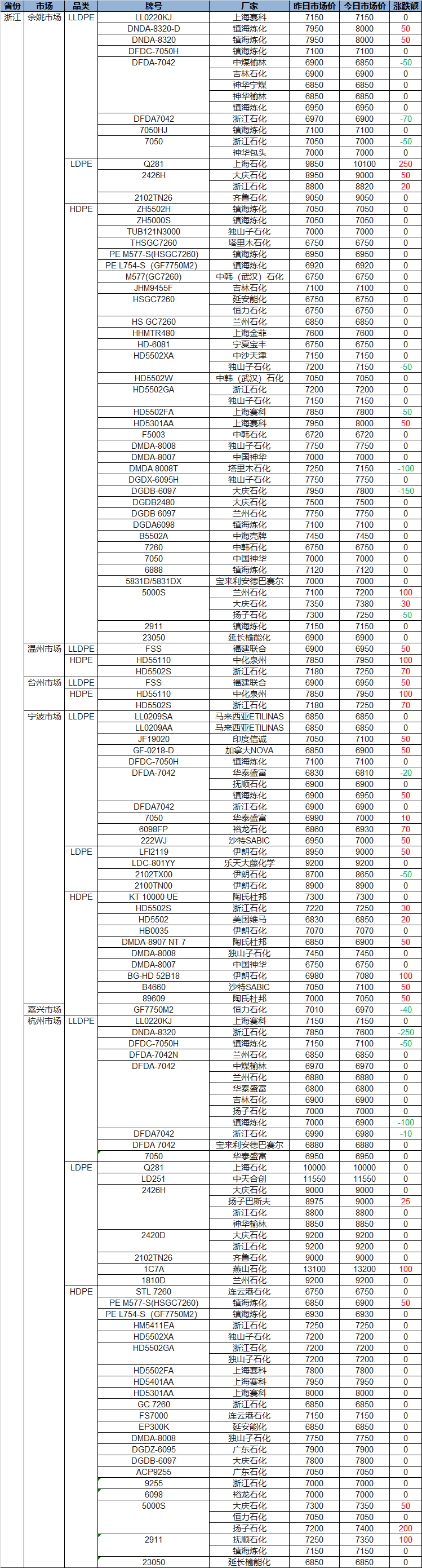 Today's Pp, Pe Zhejiang Plastic Prices: Pe Up/Down Max 250; Pp Mostly Red, Max Up 300