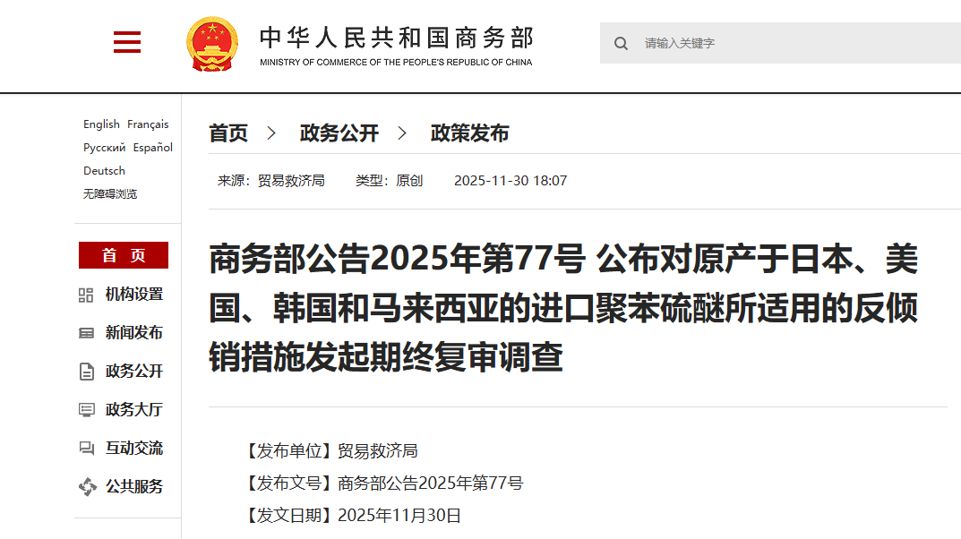 Special Plastics Vision has learned from the Ministry of Commerce website that on November 30, the Ministry of Commerce issued Announcement No. 77 of 2025, announcing the initiation of an expiry review investigation on the anti-dumping measures applicable to imported polyphenylene sulfide originating from Japan, the United States, South Korea, and Malaysia.