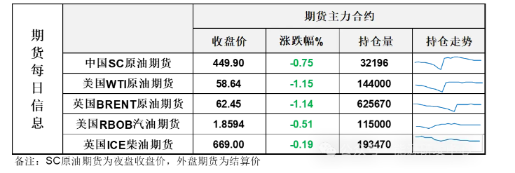 On December 2nd, concerns about long-term oversupply in the market persist, and the developments of the Russia-Ukraine situation continue to be weighed, leading to a decline in international oil prices. NYMEX crude oil futures for the January contract fell by $0.68 per barrel to $58.64, a decrease of 1.15% compared to the previous period. ICE Brent crude futures for the February contract fell by $0.72 per barrel to $62.45, a decrease of 1.14% compared to the previous period. China's INE crude oil futures for the 2601 contract fell by 0.1 to 453.3 yuan per barrel, with the night session dropping 3.4 to 449.9 yuan per barrel.