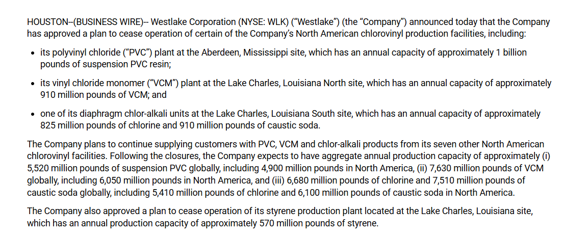 In December, the plant closure plans in North America are equally intense. Westlake Chemical announced the closure of its suspension PVC plant in Aberdeen, Mississippi (with an annual capacity of 450,000 tons), its VCM plant in Lake Charles, Louisiana (with an annual capacity of 413,000 tons), as well as the diaphragm caustic soda facility and styrene plant in the same area.