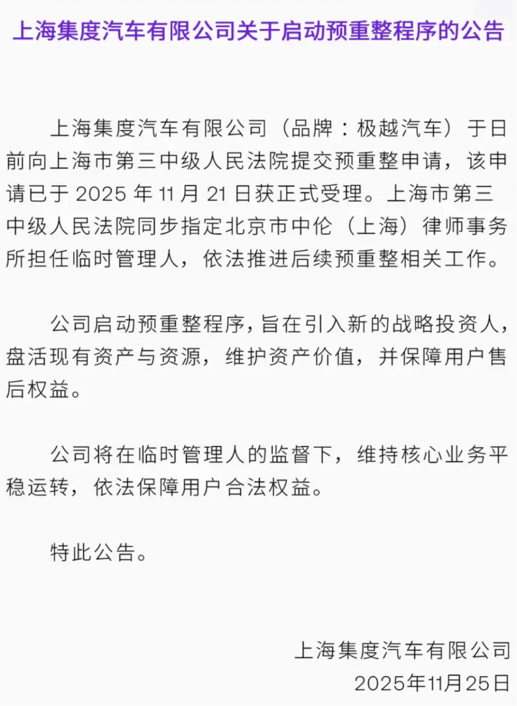 According to Jiyue Auto, Shanghai Jidu Automotive Co., Ltd. announced on November 25 that the company recently submitted a pre-restructuring application to the Shanghai Third Intermediate People's Court, which was officially accepted on November 21, 2025.