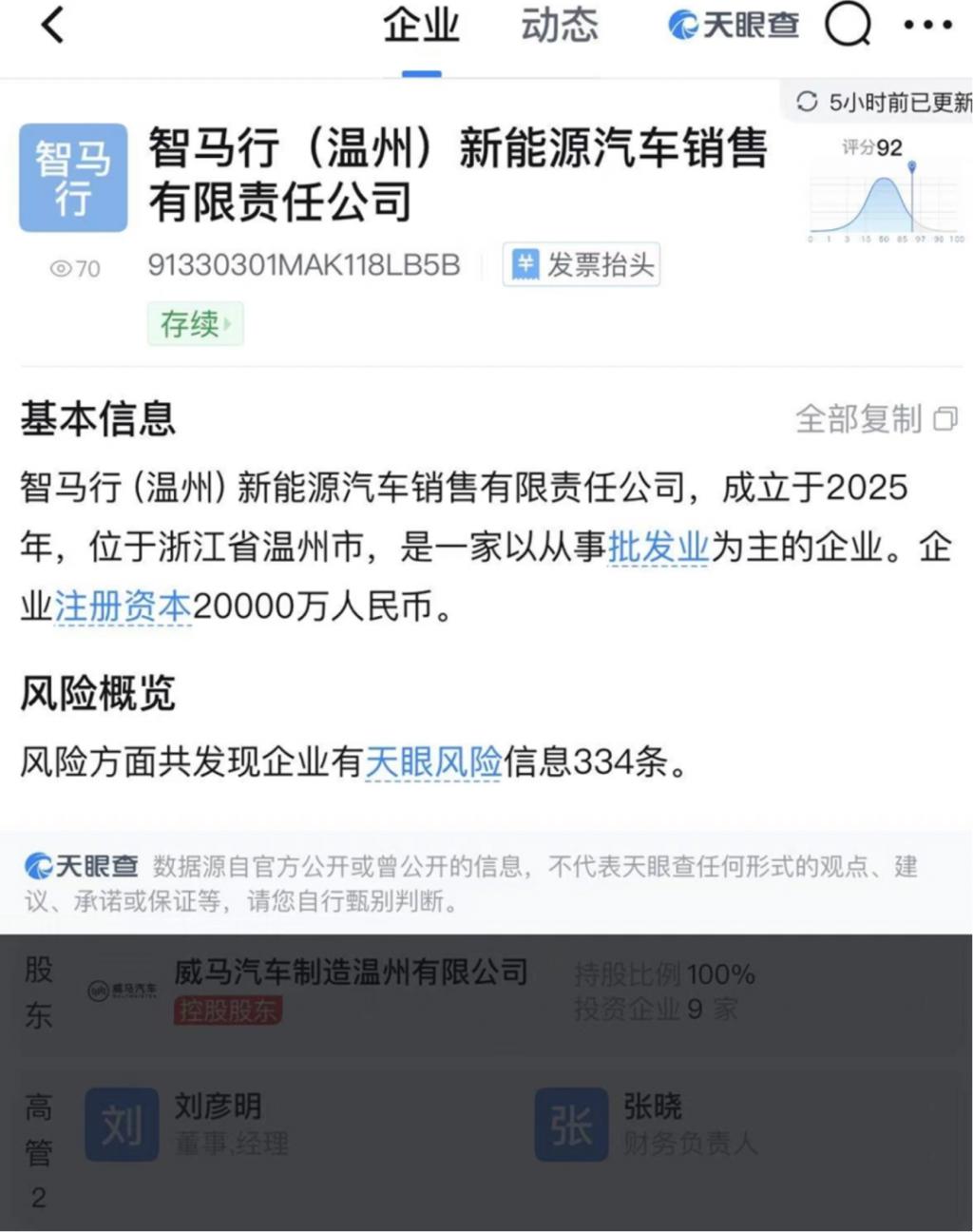 According to the Tianyancha app, on November 27, Zhima Hang (Wenzhou) New Energy Vehicle Sales Co., Ltd. was established with a registered capital of 200 million RMB. Its business scope includes the sales of complete new energy vehicles, sales of new energy vehicle electrical accessories, and automobile sales, among others.