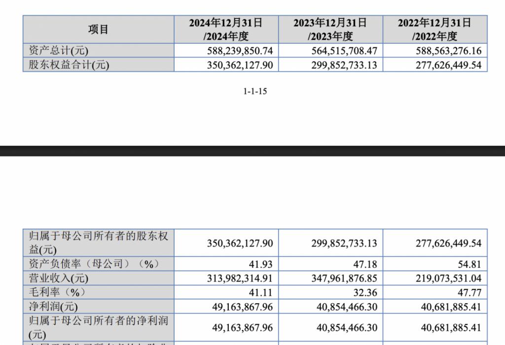 From 2022 to 2024, Changjiang Nengke's operating revenues were 219 million yuan, 348 million yuan, and 314 million yuan, respectively. The net profits were 40.6819 million yuan, 40.8545 million yuan, and 49.1639 million yuan, respectively. The gross profit margins were 54.81%, 47.18%, and 41.93%, respectively.