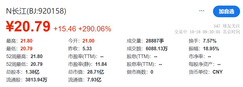 Leju Finance Wang MinOn October 16, Changjiang Nengke (BJ: 920158) was listed on the Beijing Stock Exchange, with Guotai Haitong as the sponsor. It opened with a 290% increase, resulting in a total market value of 2.87 billion yuan.
