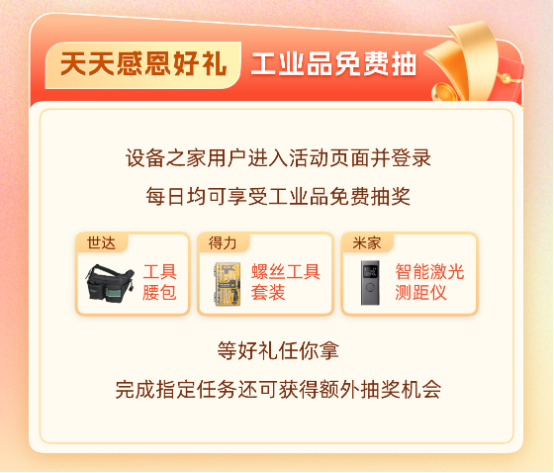 No complex tasks, no high expenses! Simply search for the "" (Equipment Home) mini-program on WeChat and enter the event page to participate in daily free industrial product lotteries! Stanley tool sets, Deli screwdriver tools, Mijia smart laser rangefinders, practical waist bags, and other great prizes are up for grabs with a super high winning probability. If you want to unlock extra lottery chances, just complete simple designated tasks to draw more and win more, allowing you to reap practical goodies while procuring supplies, adding "new items" to your workshop toolbox without spending a penny.