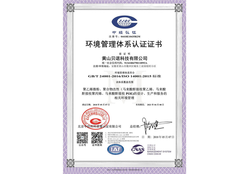 Huangshan Beno Technology Co., Ltd. was established in 2006, and is a technology enterprise invested and built by Huangshan Supply and Marketing Group Co., Ltd., Shekangda Industrial Co., Ltd. of Huizhou District, Huangshan City, and others. It specializes in the research, development, production, and sales of functional polymer materials, and has successively passed ISO9001 quality management system, ISO14001 environmental management system certification, and safety production standardization certification. Relying on the group's advantages, the company possesses advanced production technology and modern production and testing equipment. With strong technical capabilities, it has its own independent R&D center, focusing on independent innovation, and collaborates with multiple universities. After years of development and vigorous efforts, it has successfully developed a series of high-tech products such as functional additives, compatibilizers/toughening agents, adhesives, thermoplastic powders, and functional masterbatches, which are widely used in industries such as fiberglass, alkaline batteries, activated carbon filters, wood-plastic composites, modified plastics, powder coatings, metal coatings, and pipeline anti-corrosion. The product quality and market share are at an advanced level domestically.