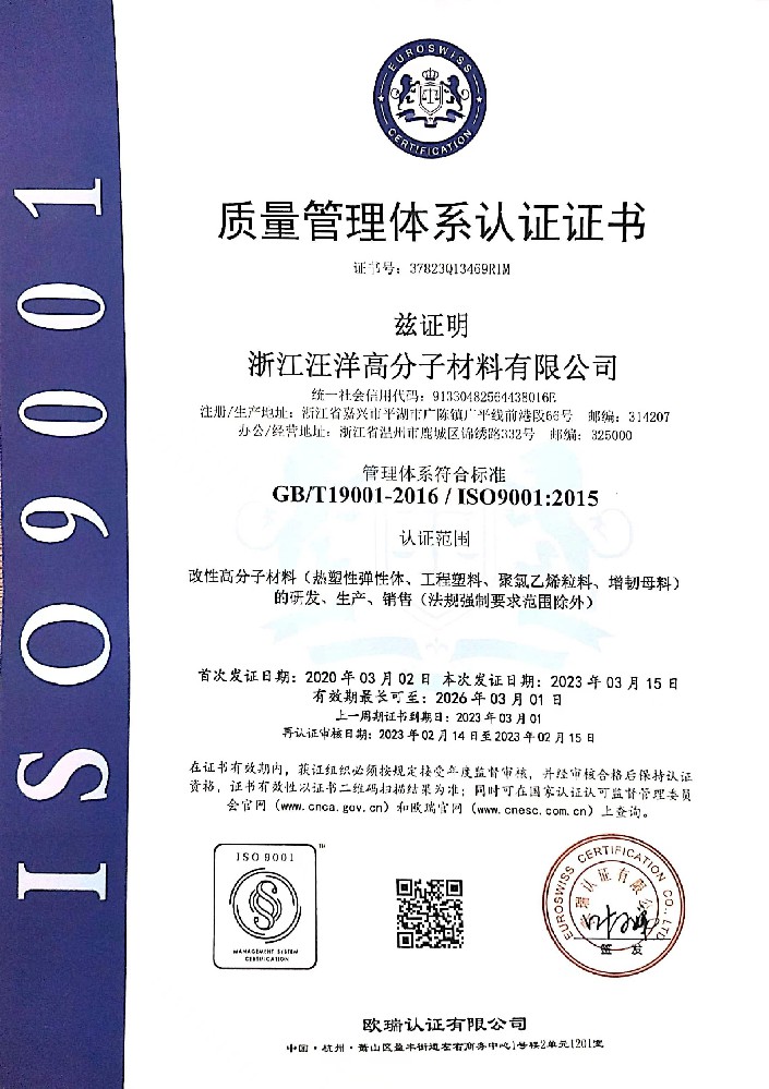 Wangyang Polymer is a specialized manufacturer of various thermoplastic elastomers (TPE, TPR, TR for injection molding, extrusion, calendering, transparent, medical, and two-shot dual-color injection materials), polyvinyl chloride (PVC for transparent medical tubing, drip tubes, crystal clear, matte finish elastic pellets), engineering plastics [PC transparent, PC/ABS alloy, PA6, PA66 (flame retardant, reinforced toughened, etc.)], and impact modifier masterbatch series. Currently, we possess multiple advanced production lines and a wealth of scientific and technological talent. Product development, manufacturing processes, and quality inspection have always been the leading factors driving Wangyang's development. Our product series have been widely applied in medical devices, stationery, automotive parts, low-voltage electrical appliances, sports equipment, and small commodities, occupying a significant market share. After years of effort, we have obtained certifications from multiple institutions, including ROHS, PAHS, NP, EC, REACH from Germany's TÜV, Switzerland's SGS, Hong Kong’s Materials Technology Department, the European Union, and the US FDA.