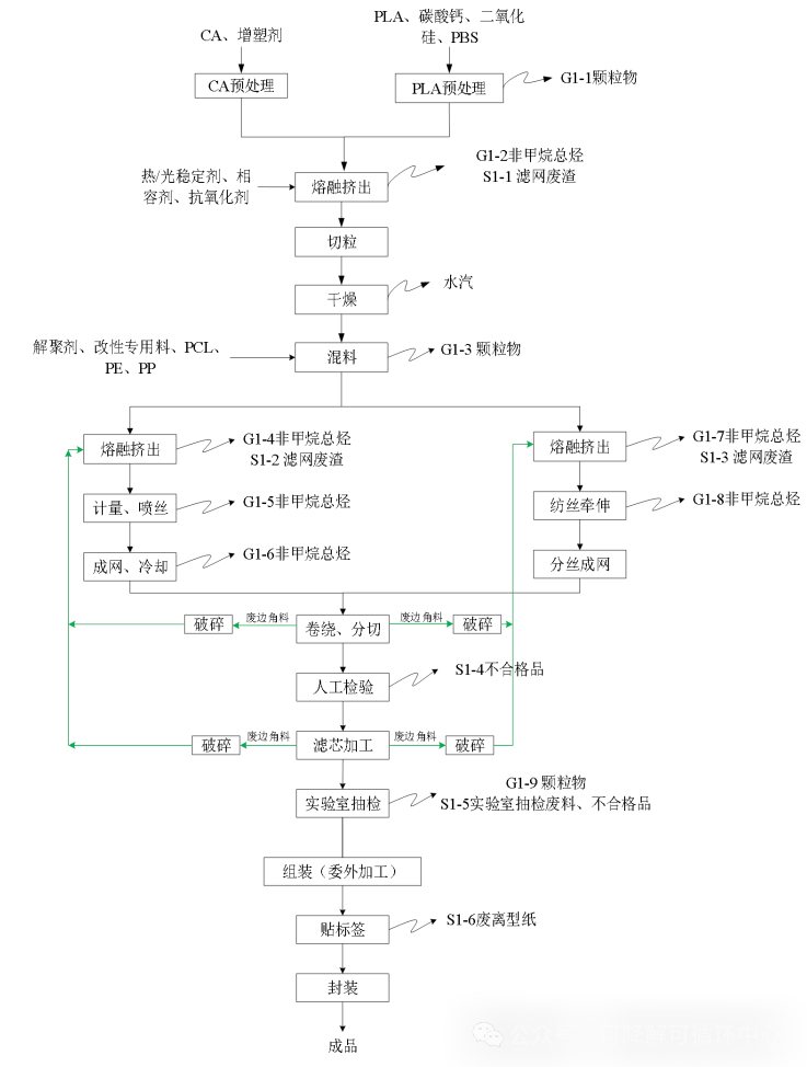 CA/PLA pretreatment – melt extrusion – pelletizing – drying – blending – meltblown fabric processing (melt extrusion – metering, spinning – web formation and cooling) or nonwoven fabric processing (melt extrusion – fiber spinning and drawing – fiber separation and web formation) – winding and slitting – manual inspection – filter element fabrication – laboratory spot check – assembly (outsourced processing) – labeling – packaging – finished product.
