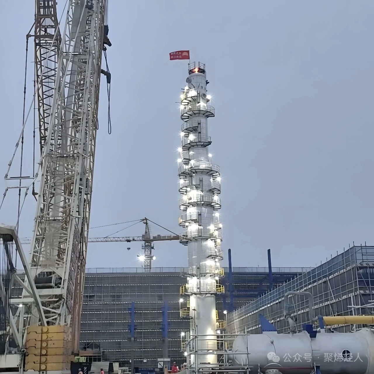 The light-ends removal column is one of the key process components of the FDPE unit. After the installation of insulation and internal/external attachments, the equipment has a total weight of 265 tons, a height of 51.56 meters, and a diameter of 4 meters. It is characterized by its massive scale and stringent requirements for hoisting precision.