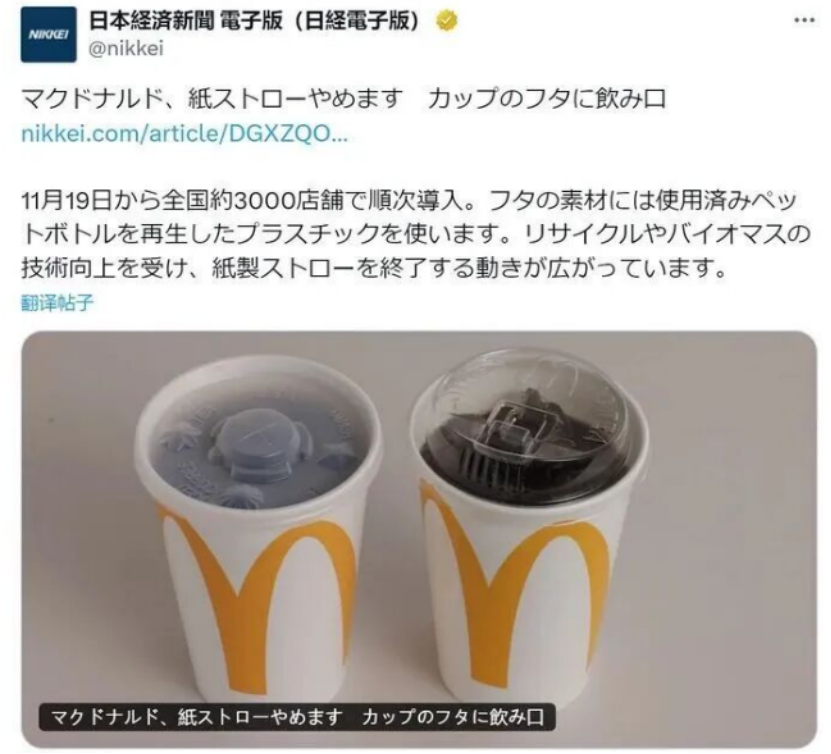 McDonald's Japan announced.Starting from November 19, we will gradually stop using paper straws and instead introduce a new design with a built-in drinking hole directly on the beverage cup lid. The lid is made from 100% recycled PET plastic sourced from discarded plastic bottles. The lid features a drinking hole for direct consumption, reducing the risk of spills, especially optimized for carbonated beverages to prevent splashing. Environmental goal: This initiative is part of McDonald's sustainability plan for 2022-2025, which is expected to reduce the use of virgin plastic by approximately 6,600 tons annually.