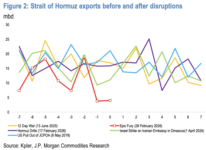 The incident triggered an actual blockade of the world's most critical energy transit chokepoint—the Strait of Hormuz. According to JPMorgan data,The oil exports through the Strait of Hormuz on February 28th have dropped sharply from the normal level of about 16 million barrels per day to about 4 million barrels per day, and almost all of it is Iranian crude.