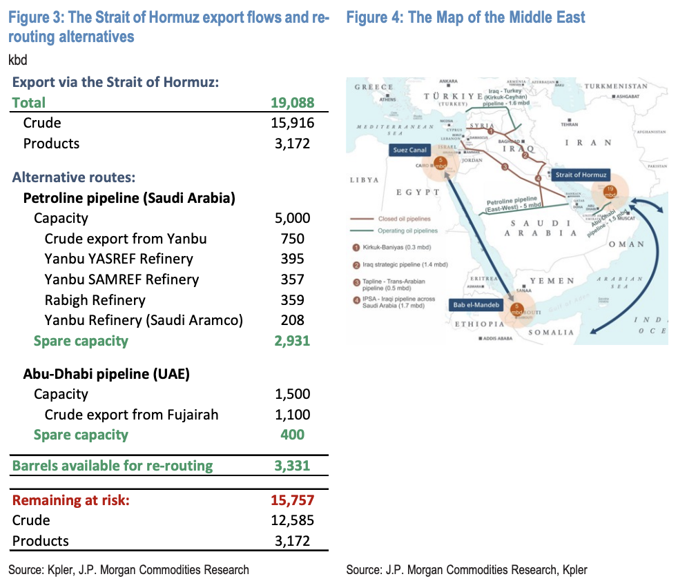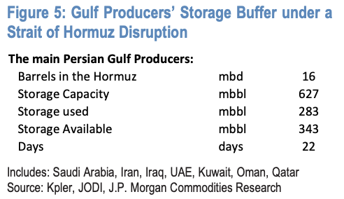 JPMorgan estimates that the seven Gulf oil producers reliant on the Strait of Hormuz for exports (Saudi Arabia, the UAE, Iraq, Kuwait, Iran, Qatar, and Oman) collectively have around 343 million barrels of available onshore crude storage capacity. At current production levels, this equates to approximately 22 days of production buffer.