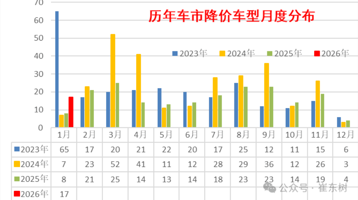 Reviewing the pace of price reductions over the past three years, 2023 saw a generally high frequency of price cuts. In 2024, the intensity of price reductions peaked in March-April. However, 2025 witnessed a significant cooling of industry promotions, with a sharp decrease in discounted models from April to October. The wave of price cuts at the start of 2026 directly disrupted this stable trend.
