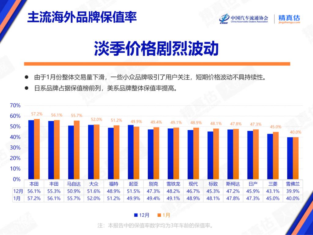 In the joint venture brands, the top three models on the January list all came from Japanese brands: Honda, Toyota, and Mazda, with three-year residual values of 57.2%, 56.1%, and 55.7% respectively, an increase of 1.1%, 0.8%, and 4.8% month-on-month. Nissan and Mitsubishi, also Japanese brands, ranked twelfth and thirteenth on the list with residual values of 47.3% and 45.0% respectively, an increase of 1.4% and 1.9% month-on-month. Simply put, all five Japanese brands on the January list saw month-on-month growth, especially Mazda, which significantly improved its ranking and growth rate.