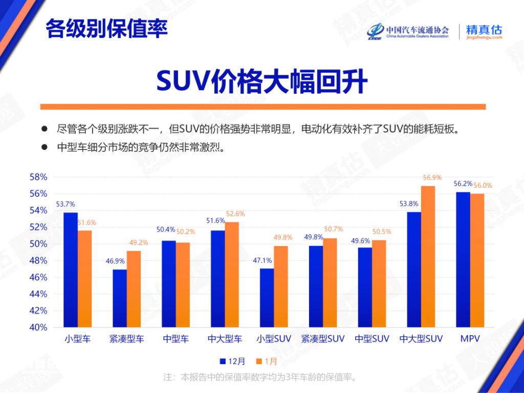 On February 2nd, the China Automobile Dealers Association released the "China Automobile Retention Rate Research Report for January 2026." The report shows that in January, the highest three-year retention rate among all vehicle classes was the mid-to-large SUV class, at 56.9%, a significant increase of 3.1% month-over-month. The three-year retention rate for the MPV class was 56.0%, a month-over-month decrease of 0.2%. Mid-to-large sized cars and small cars had retention rates of 52.6% and 51.6%, respectively, with the former increasing by 1.0% month-over-month and the latter decreasing by 2.1% month-over-month. In addition, the three-year retention rates for compact SUVs, mid-size SUVs, mid-size cars, small SUVs, and compact cars were 50.7%, 50.5%, 50.2%, 49.8%, and 49.2%, respectively. The report pointed out that "Although the retention rates of various vehicle classes fluctuated, the price strength of SUVs is very obvious, and electrification has effectively compensated for the energy consumption shortcomings of SUVs."