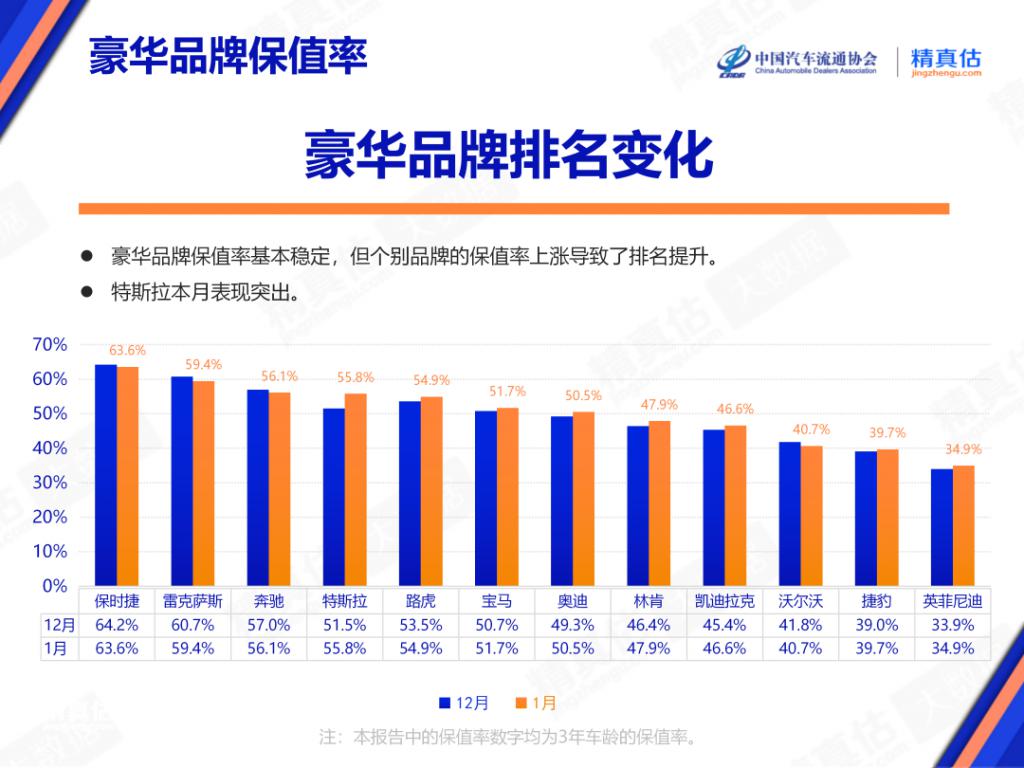 In the three-year value retention rates of international brands, the top three luxury brands in January were Porsche, Lexus, and Mercedes-Benz, with rates of 63.6%, 59.4%, and 56.1%, respectively, representing month-on-month declines of 0.6%, 1.3%, and 0.9%. Volvo also experienced a month-on-month decrease, with its three-year value retention rate dropping by 1.1% to 40.7%. All other brands recorded month-on-month growth. Tesla and Land Rover, which rounded out the top five, saw their three-year value retention rates reach 55.8% and 54.9%, with month-on-month increases of 4.3% and 1.4%, respectively. Additionally, BMW (51.7%), Audi (50.5%), Lincoln (47.9%), Cadillac (46.6%), Jaguar (39.7%), and Infiniti (34.9%) all achieved month-on-month growth in their three-year value retention rates.