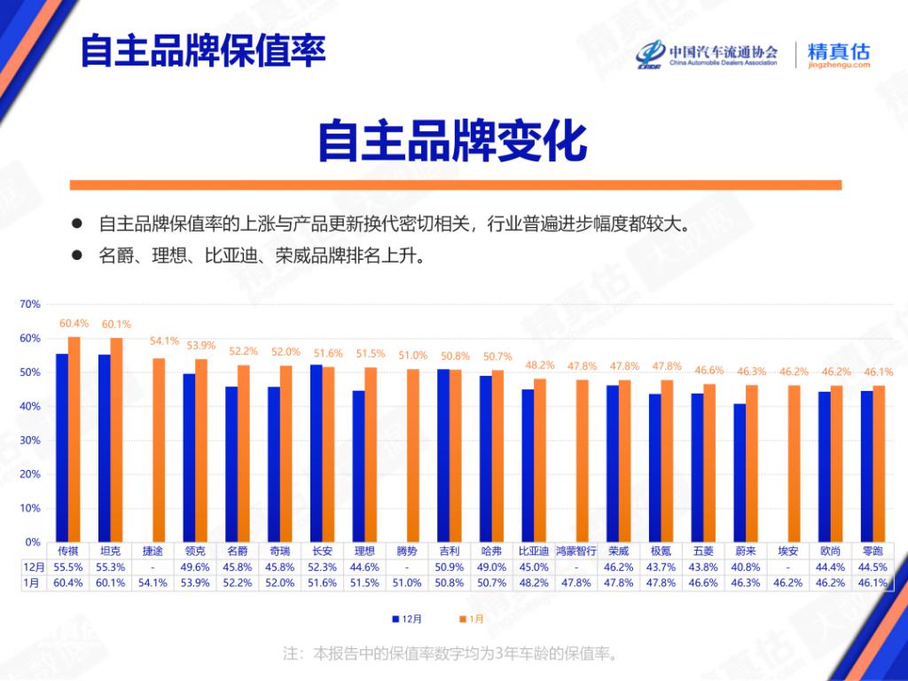 Finally, let's look at the new energy vehicle sector. Divided by powertrain type, the three-year residual value of plug-in hybrid models in January was 46.8%, an increase of 4.1% compared to 42.7% in December. The residual value of pure electric models was 44.8%, an increase of 2.4% compared to 42.4% in December. The report points out: "The overall residual value of new energy vehicles has significantly rebounded in the new year, including a large number of models that have undergone 'official price cuts' after facelifts. Hybrid vehicles have seen a larger increase in residual value, which is precisely due to the hot sales of plug-in hybrid vehicles accelerating the elimination of fuel vehicles."