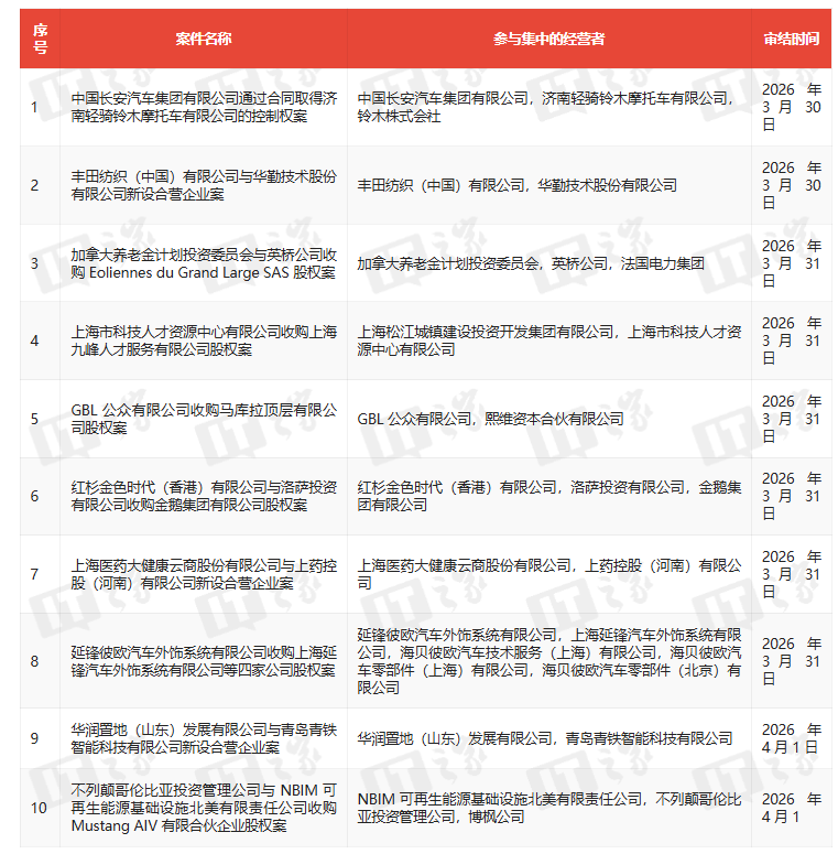April 13 report, today, the State Administration for Market Regulation announced the list of unconditionally approved business concentration cases from March 30 to April 5, 2026, including the case where China Changan Automobile Group Co., Ltd. obtained control over Jinan Qingqi Suzuki Motor Co., Ltd. through a contract, and the case of the new joint venture between Toyota Textile (China) Co., Ltd. and Huaqin Technology Co., Ltd.