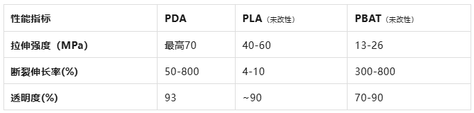 Compared to PBAT, PDA exhibits higher strength and better transparency. Although PBAT is flexible, it has relatively low strength and only moderate transparency, making it difficult to meet the dual demands of high-end packaging for both mechanical performance and visual appearance.