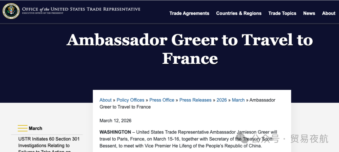On March 12, the U.S. Department of the Treasury and the Office of the U.S. Trade Representative each issued statements.China and the U.S. economic and trade teams will hold talks in Paris, France, from March 15 to 16.。