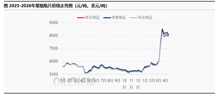 The domestic polyester bottle resin market in April showed a "V"-shaped trend, with the monthly average price steadily rising. The overall average price for the month was 8,609 yuan/ton, an increase of 515 yuan/ton compared to the previous month, a rise of 6.38%. The mainstream price range remained between 8,300 and 8,900 yuan/ton. Looking at the performance of major domestic markets, the average price in the East China region in April was 8,609 yuan/ton, up 516 yuan/ton from 8,093 yuan/ton in March, an increase of 5.98%, and up 51.29% year-on-year compared to 5,690 yuan/ton in April 2025. The average price in the South China region in April was 8,719 yuan/ton, up 470 yuan/ton from 8,249 yuan/ton in March, an increase of 5.39%, and up 51.82% year-on-year. The average price in the North China region in April was 8,457 yuan/ton, up 432 yuan/ton from 8,025 yuan/ton in March, an increase of 5.10%, and up 48.94% year-on-year.
