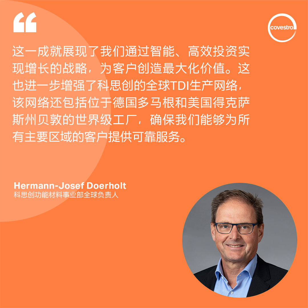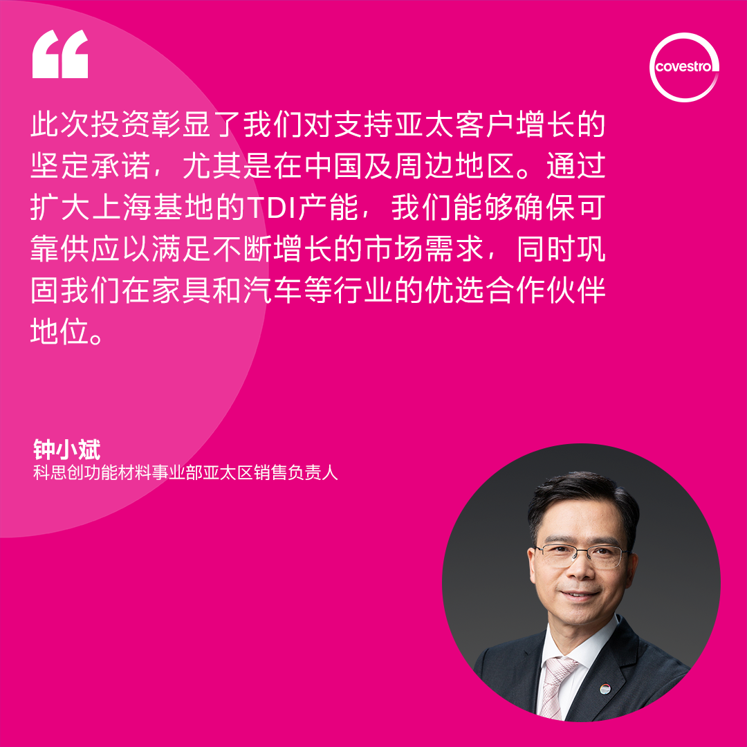 Covestro announces successful completion of Toluene Diisocyanate (TDI) production facility at its Shanghai Integrated Site. Large-scale capacity expansion and renovation project This upgrade significantly increases the TDI annual production capacity from 310,000 tons to 370,000 tons. Increase of nearly 20% , further strengthening Covestro's position as a leader in the Asia Pacific regionLeading TDI supplier one of the most important positions