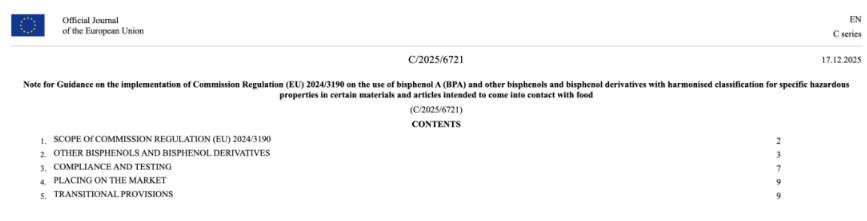 On December 17, 2025, the Official Journal of the European Union published Implementation Guidelines No. C/2025/6721, addressing...Regulation (EU) 2024/3190Release of a special Q&A interpretation on the BPA ban in food contact materials.