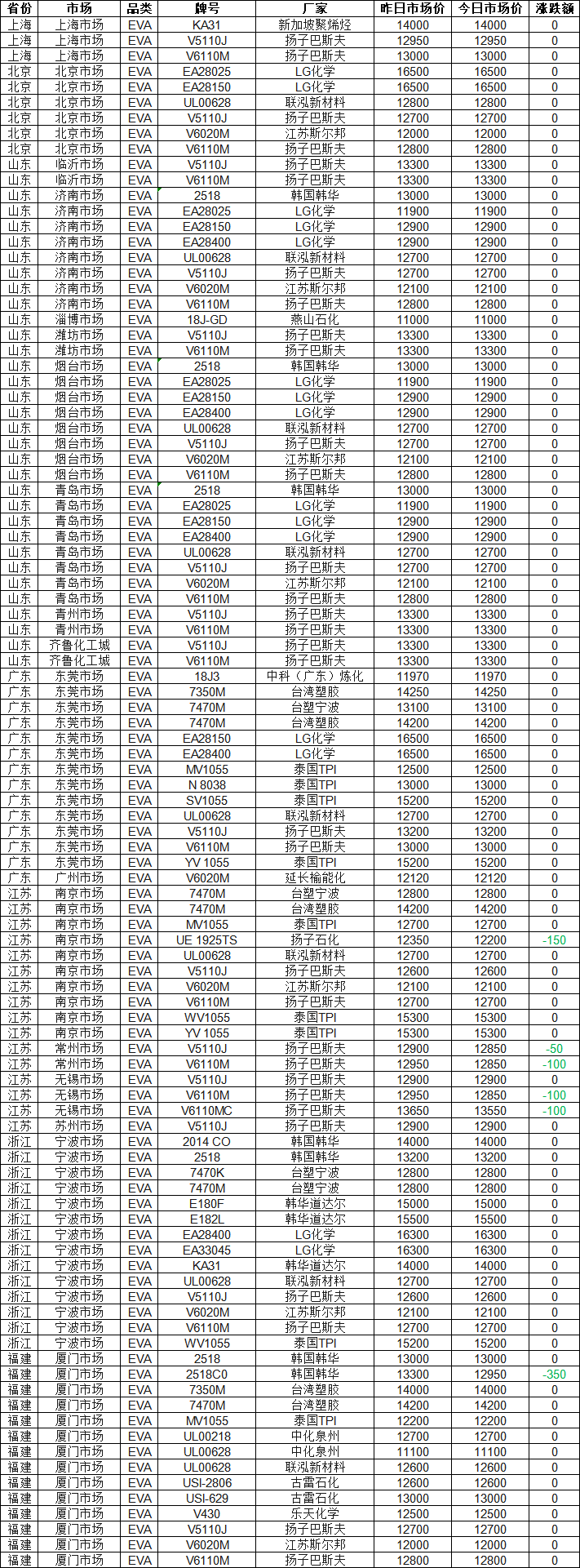 According to Zhuan Su Shi Jie statistics, as of 4:00 p.m. on April 23, the national EVA market remained generally stable with slight downward adjustments! 94% of quotations across the market were unchanged, with the maximum decline reaching RMB 350 per ton. Currently, the quotation for South Korea’s Hanwha 2518C0 in the Xiamen market stands at RMB 12,950 per ton. Today’s nationwide EVA quotation range is RMB 11,000–16,500 per ton, with the market median at RMB 12,900 per ton. Below are today’s market quotations in detail.