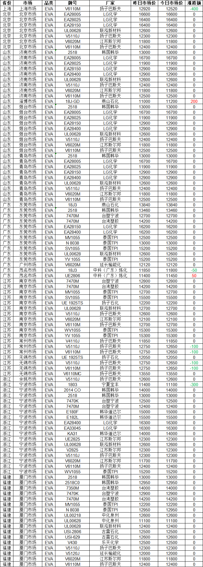 According to the statistics from ZuanShu World, as of 4:00 PM on April 28, the EVA market in various regions across the country has shown a steady trend with slight declines! 91% of the market quotes remained stable, with the highest drop being 400 yuan. The current quote for Yangzi Basf V6110M in the Shanghai market is 12,520 yuan. Today, the EVA quote range for the entire market is 11,100 to 16,700 yuan, with the median of the market being 12,600 yuan.