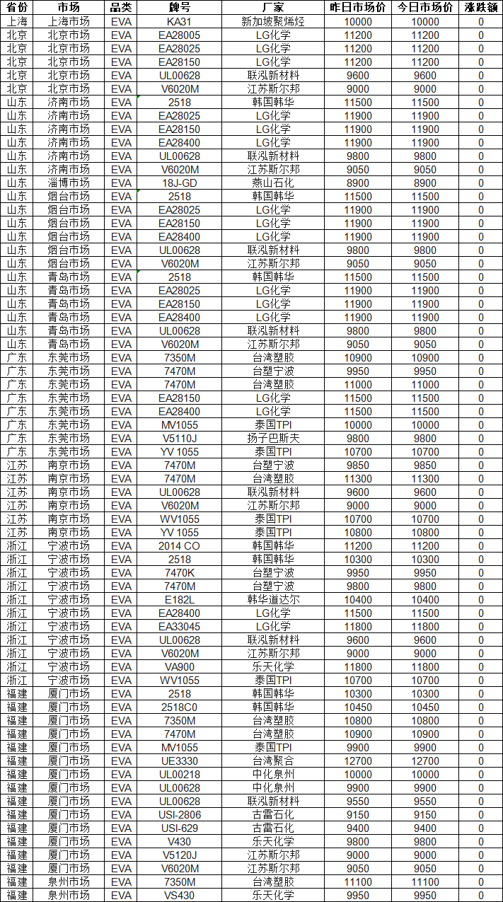 Today, the EVA market price range across the entire market is 8900-12700 RMB, with a market median of 10425 RMB.