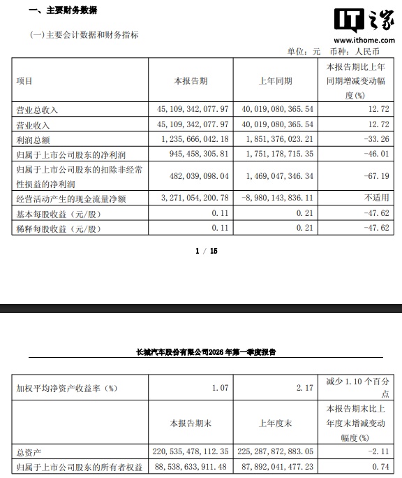IT Home reported on April 24 that Great Wall Motor has released its latest Q1 2026 report, with IT Home summarizing as follows: