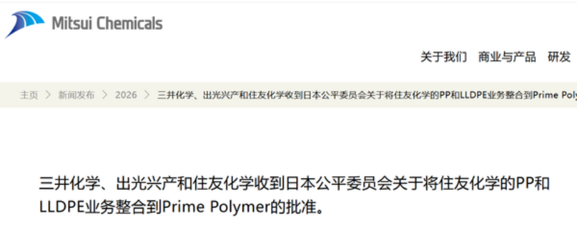 Mitsui Chemicals, Idemitsu Kosan, and Sumitomo Chemical reached a basic cooperation agreement on September 10, 2025. The three companies plan to integrate the polyolefin (PO) business operated by Prime Polymer Co., Ltd. (PRM), a joint venture between Mitsui Chemicals and Idemitsu Kosan, with Sumitomo Chemical's polypropylene (PP) business and linear low-density polyethylene (LLDPE) business in Japan. This integration aims to establish a core industry that supports Japan's industrial development and has strong risk resistance, enhancing the comprehensive competitiveness of PP and polyethylene (PE) businesses in Japan. On December 24, 2025, the three companies formally signed the business integration agreement and related joint venture agreements.