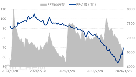 As of 2026 Year 1 Moon 28 On [Date], the inventory level of Chinese polypropylene manufacturers was at [Number]. 40.09 Ten thousand tons, a decrease compared to the previous period. 3.2 ten thousand tons, a month-on-month decrease of 7.38% Upstream manufacturers appropriately adjusted prices due to cost support, actively destocked to mitigate year-end inventory risks, and downstream factories replenished their stock as needed. Consequently, manufacturers' inventory slightly decreased during the week.