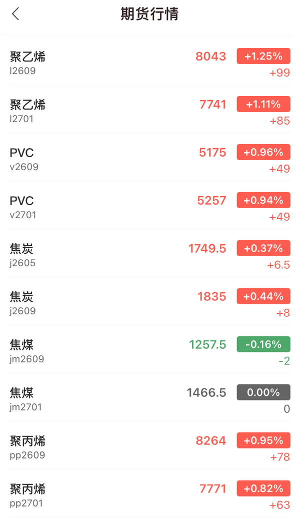 The PP2609 contract was quoted at RMB 8,264 per ton, up 0.95% from the previous trading day.