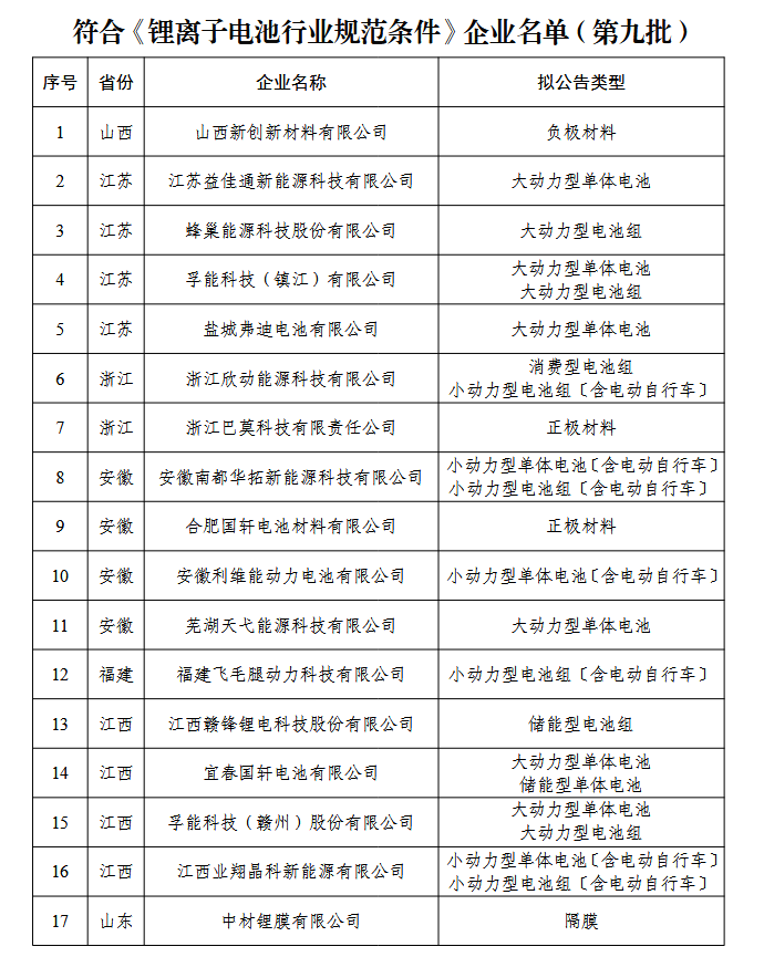 In accordance with the "Specifications for the Lithium-ion Battery Industry (2024 Edition)" and the "Administrative Measures for the Announcement of Compliance with the Specifications for the Lithium-ion Battery Industry (2024 Edition)," after procedures including enterprise application, recommendation by provincial industrial and information technology authorities, expert review, on-site verification, and online public notice, the list of enterprises (Ninth Batch) compliant with the "Specifications for the Lithium-ion Battery Industry" is hereby announced.