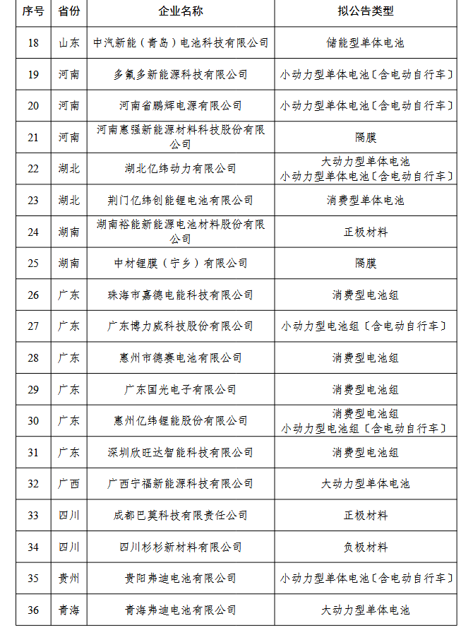 A total of 36 companies have been shortlisted, with their publicly listed categories including energy storage batteries, power batteries, cathode materials, anode materials, separators, and consumer batteries.