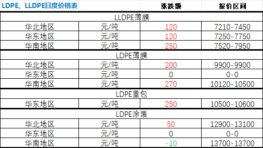 According to Zhuan Su Vision statistics, on March 5, LLDPE prices rose across all major regions nationwide, while LDPE prices mostly increased with few declines. Specifically: LLDPE film prices rose by RMB 120/ton in North China and East China, and by RMB 250/ton in South China. LDPE film prices increased by RMB 200/ton in North China, remained unchanged in East China, and rose by RMB 270/ton in South China. LDPE heavy-duty bag prices in East China rose by RMB 250/ton. LDPE coating prices increased by RMB 50/ton in North China, remained flat in East China, and dropped by RMB 10/ton in South China.