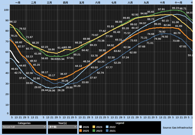 At the same time, the energy situation in Europe further intensified market anxiety. In January 2026, many parts of Europe experienced the coldest cold wave in nearly fifteen years, with temperatures 3 to 4 degrees Celsius lower than the average. As of January 17th, the EU's overall natural gas storage rate had fallen to approximately 50.4%, significantly lower than the 61.7% of the same period last year, with the storage levels in major economies such as Germany and France even falling below 43%.