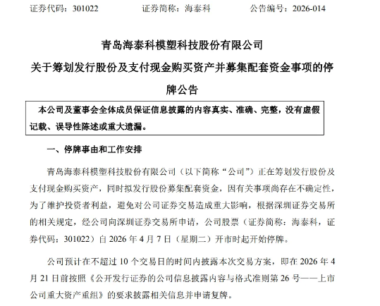 Net Profit Forecast Rises Over 300 Percent, Haitaike Suspends Trading for Cross-Industry Acquisition, Targeting High-Molecular Material "Second Growth Curve"
