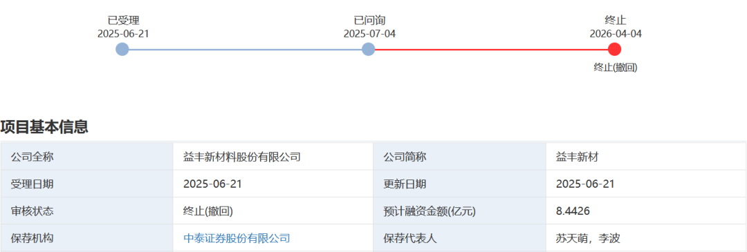 Yifeng New Materials applied for IPO on the ChiNext in June 2025 and was accepted; however, on April 4, 2026, the Shenzhen Stock Exchange decided to terminate its ChiNext IPO review due to the withdrawal of the IPO application by both the issuer and the sponsor.