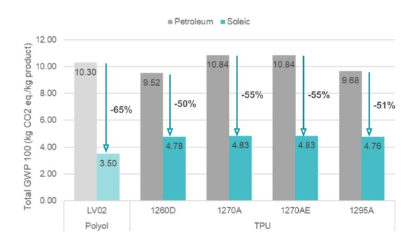 This initial Product Carbon Footprint (PCF) study, conducted in collaboration with the independent sustainability agency TrueNorth Collective, found that Soleic® polyols and thermoplastic polyurethane (TPU) consistently achieved a 50% to 65% reduction in carbon emissions across key product grades.