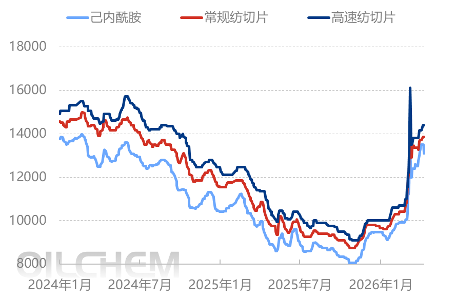 Downstream demand remains weak, and the market is cautious about purchasing chips, combined with an upward trend in some chip inventories, which has led to a slight decline in polymer factory prices. Currently, the price of conventional spun PA6 in East China is 13,500-13,600 yuan/ton cash short delivery, and high-speed spun products are 14,000-14,200 yuan/ton acceptance delivery.