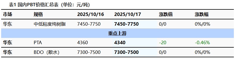 Table 2 Overview of Domestic PBT Data (Unit: Tons, Yuan/Ton)