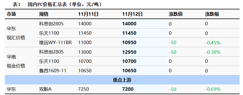 Table 2 Domestic PC Data Overview (Unit: Yuan/Ton)