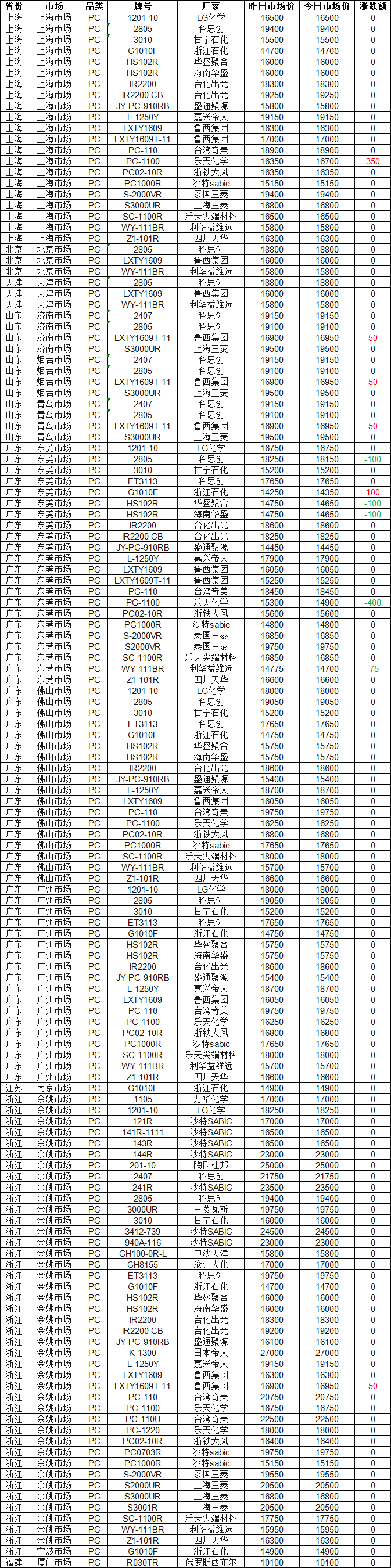 According to Zhuanshu Vision statistics, as of 16:00 on April 8, polycarbonate (PC) market prices across China showed mixed movements: 4% of quotations rose, while another 4% declined, with the largest increase at RMB 350 and the steepest drop at RMB 400. The current price for Lotte Chemical's PC-1100 in the Shanghai market is RMB 16,700. Today's nationwide PC price range stands at RMB 10,100–27,000, with a market median of RMB 16,850.