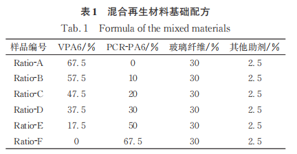 Mix VPA6, PCR-PA6, and the modifier in a mass ratio evenly and add them to the main feed port of a twin-screw extruder. Add glass fibers in a mass ratio to the side feed port, and obtain modified plastic granules of PA6-GF30 composite materials with 0%, 10%, 20%, 30%, 50%, and 67.5% recycled content through melt blending and extrusion granulation. After drying the PA6-GF30 modified plastic granules at 100°C for 4 hours, pour them into an injection molding machine to mold test specimens. Set the temperature of sections 1 to 3 to 225°C, 260°C, and 270°C, respectively, with a mold temperature of 100°C, and an injection pressure of 100-160 MPa. The basic formulations of the six mixed recycled materials are shown in Table 1.