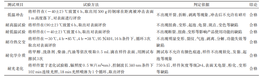 Prepare the duct support sample using the above materials and, and conduct low-temperature impact, high-temperature resistance, low-temperature resistance, thermal cycling, chemical resistance, and light aging tests. The test results show that all meet the design requirements, as shown in Table 2.