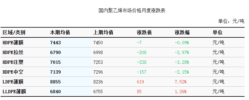 In January, China's domestic polyethylene market saw divergent price adjustments, with price fluctuations ranging from 7 yuan/ton to 619 yuan/ton across different categories.