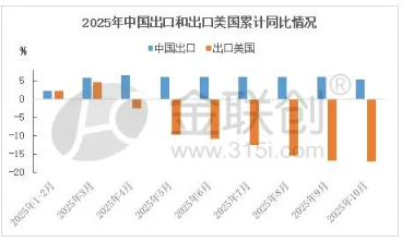 In terms of U.S. dollars, the total value of China's exports still maintained a year-on-year positive growth rate. However, the total value of exports to the United States managed to maintain positive growth in the first three months, decreased year-on-year from April to June, and the rate of decline continued to expand thereafter. This indicates that Trump's tariff policy has indeed had a real impact on China's exports to the United States. In the first ten months, the total value of China's exports increased by 5.3% year-on-year, while the total value of exports to the United States decreased by 17.1% year-on-year, with the decline continuing to widen. The impact of U.S. tariff policy is significant.